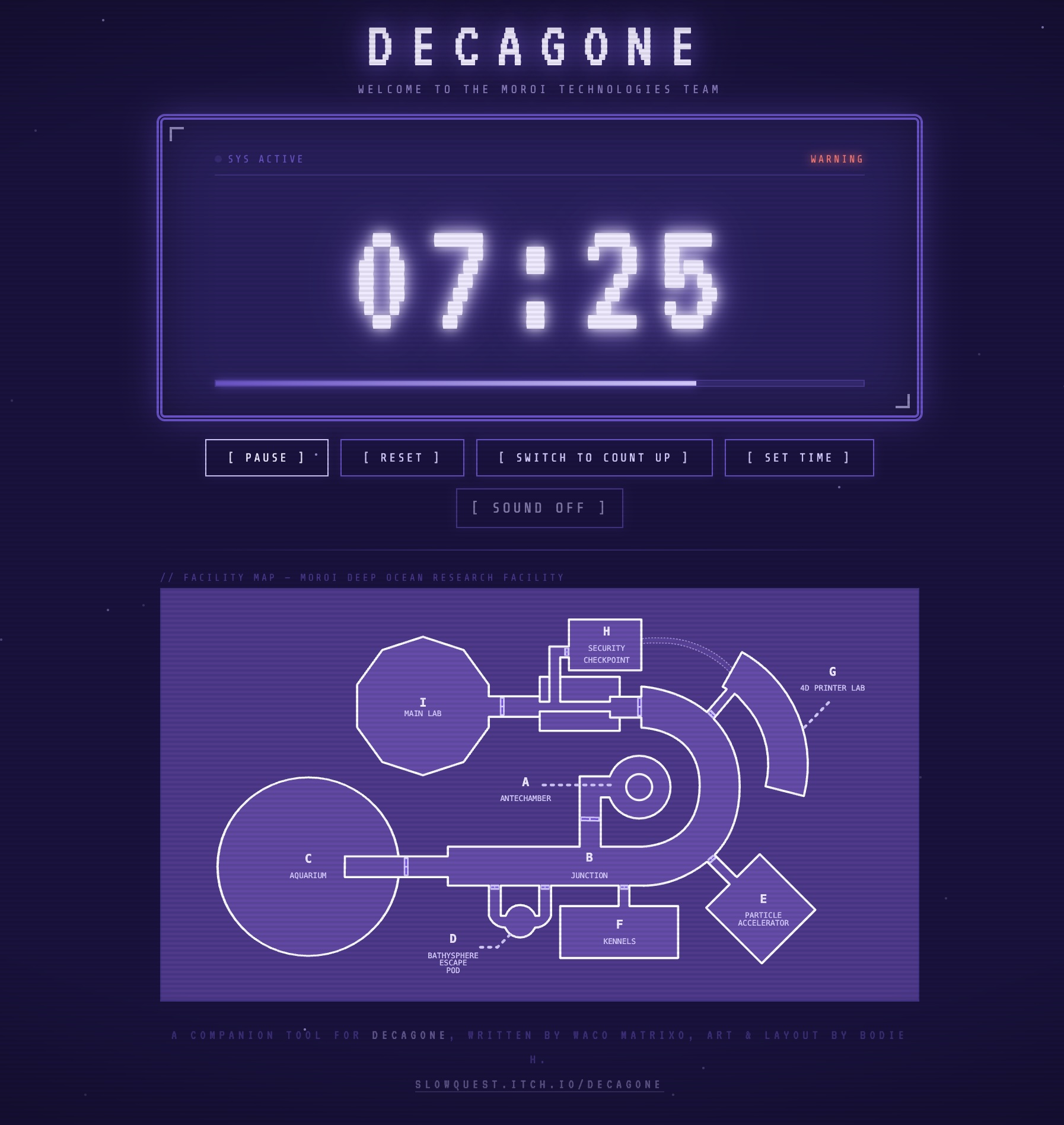 A simple timer tool for the excellent Mothership module Decagone, written by Waco Matrixo, art and layout by Bodie H.